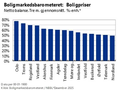 Boligmarkedsbarometeret falt noe de tre foregående månedene, men økte litt i desember. Høyere boligprisforventninger og lavere renteforventninger drar barometeret opp, mens noe lavere jobbtrygghet demper oppgangen.