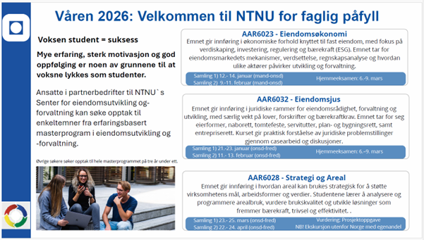 Spørsmål om faglig innhold- kontakt NTNU/Senter for eiendomsutvikling- og forvaltning direkte på mail