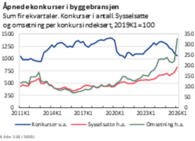 SSBs statistikk for åpnede konkurser viser at flere større bedrifter innenfor bygg- og anlegg går konkurs. Antallet åpnede konkurser i næringen nådde en topp i 2024 og har siden falt. De siste fire kvartalene er det registrert i alt om lag 1000 åpnede konkurser, til sammenligning ble det registrert 1300 konkurser i 2024. Samtidig er selskapene som den siste tiden har gått konkurs større, med i gjennomsnitt 6,8 sysselsatte siste året, mot 4,4 i forrige firekvartalers periode.
