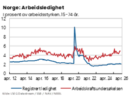 Ledighetsutviklingen målt ved AKU skiller seg fra Navs statistikk for registrerte ledige. AKU-tallene viser en sterkere økning i arbeidsledigheten enn NAVs statistikk gjør, særlig det siste halvannet året. Sammenlignet med historisk gjennomsnitt er også AKU-arbeidsledigheten høyere.